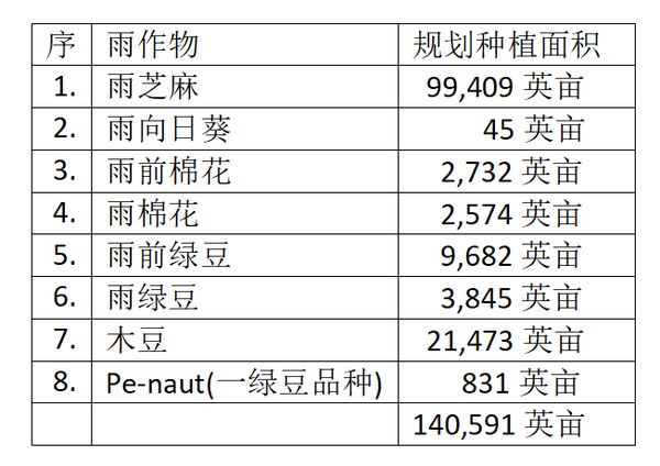 这些作物中,雨芝麻在马莱(Mahlaing)县区内种植最多,约有6万英亩。而在温敦(Wundwin)县区内雨棉花种植最多达到2,500多英亩,雨绿豆也有2,200英亩。另外在马莱县区内种植了Pe-naut这一绿豆品种豆类600多英亩。密铁拉专区内在5月中旬及6月初连续下了几场雨,所以目前作物都长势良好,这是由当地农夫们那儿获知的讯息。