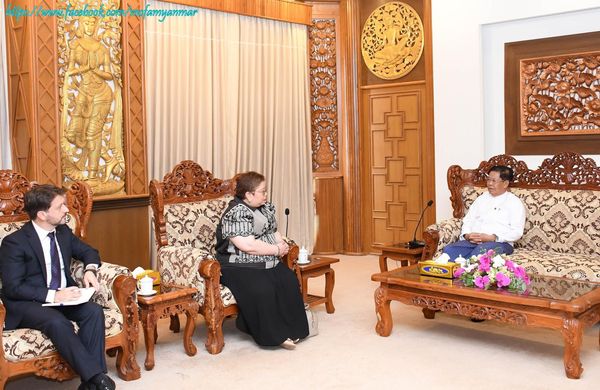 国际合作部联邦部长吴哥哥莱(U Ko Ko Hlaing)与国际移民组织(International Organization for Migration-IOM)亚太区域办公室主任Sarah Lou Ysmael Arriola 于6月27日在内比都国际合作部进行会谈。