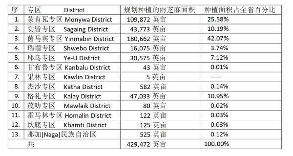 实皆省内的12个专区及那加(Naga)民族自治区规划种植的雨芝麻面积如下表: