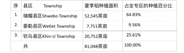 全专区共种植了81,048英亩的夏季稻,其中瑞帽县区的种植面积占了全专区种植面积的五分之三以上,钦乌县区种植面积则占全专区种植面积的 ¼ 以上。