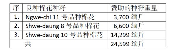 这些纯种棉花种籽将分配给敏巫专区内的敏巫、本漂(Pwintbyu)、斯林(Salin)、额别(Ngaphe)及西都岱耶(Setoktara)等5个县区内的有意愿扩大种植这棉花作物的农民们。
