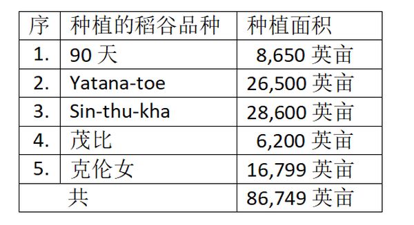 在县区内种植的雨季稻稻谷品种有90天稻谷品种、Yatana-toe稻谷品种、Sinthukha、茂比(Hmawbi)稻谷品种及克伦女(Kayin-ma)稻谷品种等。各稻谷品种的种植面积如下表: