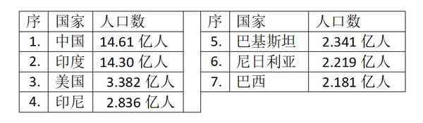世界七大人口大国: