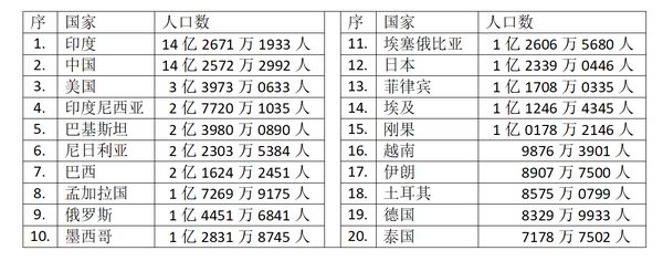 世界人口数据,今天已经是一个庞大的“天文数据”了。而世界各国的人口数据,由于有不同的统计方法,因而数据也略有差异。现在由联合国公布的,2023年7月13日世界人口最多的20个国家的人口数据如下表: