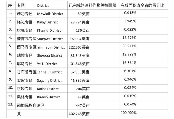 其次是耶乌专区,完成了10万多英亩的种植工作,占全省完成的种植面积的六分之一以上。接下来的蒙育瓦专区、瑞帽专区、实皆专区、甘布鲁专区及格礼专区,完成的种植面积都是数以万计英亩。其他专区及那加民族自治区所完成的种植面积只是属于一个“零头”而已了。实皆省是上缅甸地区第一农业大省,现在有那么多专区(共7个专区)完成这么多面积的油料作物种植工作,相信对整个油料作物的种植工作会起一定的推动作用。缅甸油料作物种植工作一直提不上来,人民群众的“吃油难”问题长期以来一直解决不了,实皆省方面的大种油料作物,是否能对这食用油问题的解决起一定作用,许多人们都是有所期待的了。