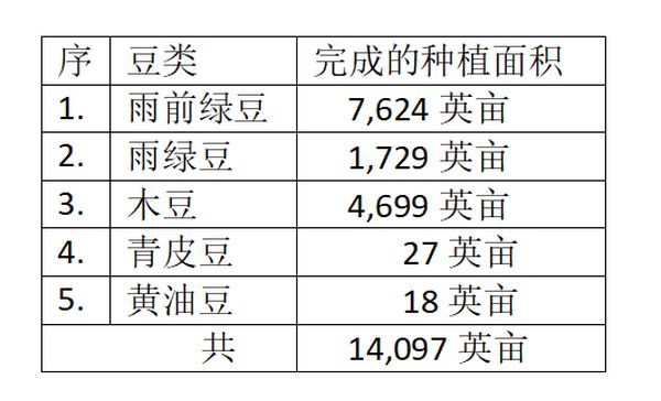 目前已种植的豆类有雨前绿豆、雨绿豆、木豆、青皮豆及黄油豆等共14,097英亩,各种豆类目前完成的种植面积如下表: