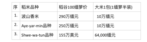而在7月份第一周内,瑞帽县区内,波山(Pawsan)香米品种稻谷及大米、Aye-yar-min品种稻谷及大米、Shwe-wa-tun(夏季稻)稻谷及大米等的行情价钱分别如下: