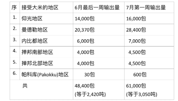 据7月17日出版的《缅甸之光》报报导,实皆省瑞帽(Shwebo)专区内的各县区,在7月份第一周内稻谷及大米价钱都略微上扬。而由瑞帽专区向其他各省邦地区也有输送出大米,主要是向仰光、曼德勒及内比都这三大都市及掸邦南北地区输出。6月份最后一周及7月份第一周期间这大米输送情况如下表: