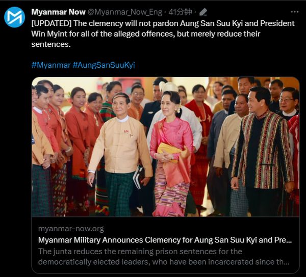 当地时间8月1日,缅甸国家管理委员会发布公告,宣布根据相关刑法条款,特赦原国务资政昂山素季和原总统温敏的部分刑罚。据缅甸媒体“今日缅甸”和“十一媒体集团”报道,特赦并不意味着赦免昂山素季和温敏的所有罪行,而只是“宽大处理”,减轻他们的刑期。