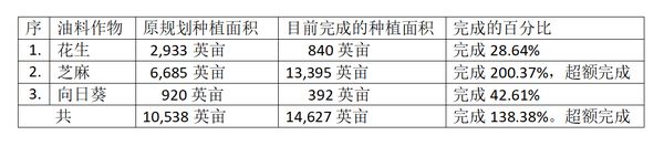 本漂县区在今年雨作物种植季节期间,为满足本地区食用油的需求并能富余向外输出,增加当地农民们的家庭收入,规划种植花生、芝麻、向日葵等油料作物共10,538英亩,到目前已完成各种油料作物14,627英亩的种植工作。原规划的种植面积及现在完成的各种油料作物的种植面积如下表: