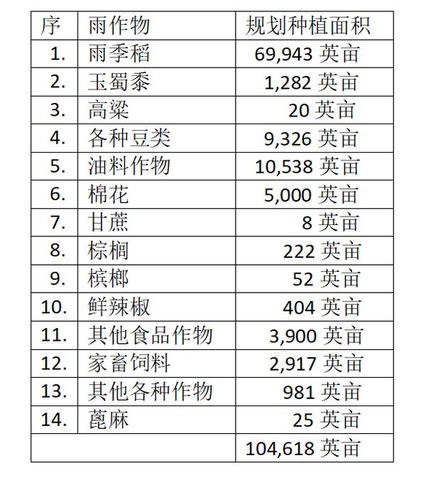 今年雨季本漂县区方面为了满足本地民众对各种粮食作物的需求,同时增加农户们的种植收入,规划种植的各种雨作物面积如下: