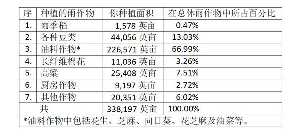 南卯县区内在这2023年雨作物种植季节期间种植的各种雨作物如下表: