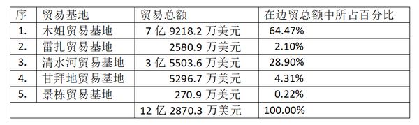 缅甸在缅中边境线上开设了木姐、雷扎(Lweje)、清水河(Chin-shwe-haw)、甘拜地(Kampaiti)及景栋(Kengtung)等5个贸易基地口岸,这5个贸易基地口岸在这近4个月的贸易总额分别如下: