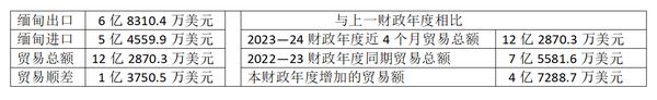 在2023—24新财政年度内,自2023年4月1日至7月21日近四个月期间,缅中边境贸易总额超过12亿美元,与上一财政年度同期相比,增加了近5亿美元。