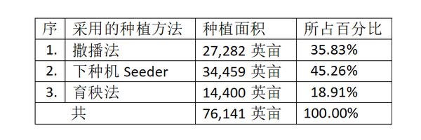 这2023年度雨作物种植季节期间种植的雨季稻,根据水土情况,采用撒播方法种植的有27,282英亩(其中湿播20,317英亩,干播6,965英亩),采用下种机Seeder种植34,459英亩,采用育秧法种植14,400英亩,共种植76,141英亩。这当中,会发现采用下种机seeder种植的农田比例最多,几乎占了全部种植面积的一半,这可以说明农民们使用农机的比例已在逐渐增高了。