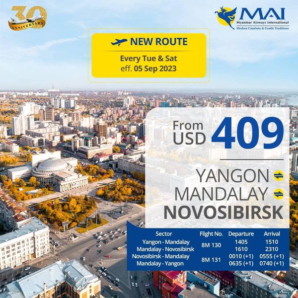 MAI航空将于9月5日开始运行俄罗斯-缅甸直飞航班,该航班从仰光机场经曼德勒当大乌机场飞往俄罗斯新西伯利亚。