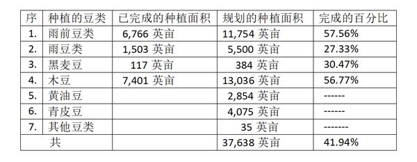 已完成种植工作的有雨前绿豆、雨绿豆、黑麦豆与木豆共15,787英亩。规划种植的雨前绿豆、雨绿豆、黑麦豆、黄油豆、青皮豆、木豆及其他豆类共有37,638英亩。已 完成的豆类种植面积与规划种植的豆类面积如下表: