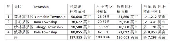 专区内的各县区中,波勒县区不论是在规划面积还是在已完成的种植面积中,都是位居第一。而且该县区实际完成的种植面积比规划面积多8,963英亩,所以虽然茵马宾县区及甘尼县区种植面积比规划面积少,但全专区种植面积还是比规划面积多了7,293英亩。