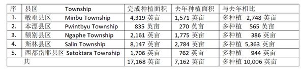 敏巫专区内的敏巫、本漂(Pwintbyu)、额别(Ngaphe)、斯林(Salin)及西都岱耶(Setoktara)等5个县区,目前已完成了这木豆17,168英亩的种植工作,而在上一年度雨季时期内,5个县区内只种植了这木豆7,162英亩。