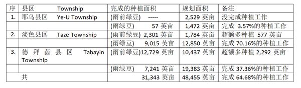 专区属下的耶乌县区、淡色(Taze)县区及德拜茵(Tabayin)县区,这3个县区目前完成的绿豆种植面积(包括雨前绿豆及雨绿豆)为31,343英亩,而全专区规划种植的绿豆(包括雨前绿豆及雨绿豆)共为48,455英亩。各县区所完成的绿豆种植面积及规划种植面积如下表:
