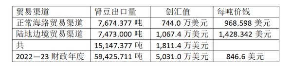 (按:如果经贸部门所公布的数据没有弄错的话,这肾豆的价钱起伏变化就太大了。上一财政年度2022—23年度时缅甸出口肾豆5.9万多吨,获得5,031万美元的收入,平均每吨肾豆价为846.6美元。今年由海路出口时,每吨肾豆获得968多美元的价钱;而由边贸出口时每吨价钱为1,428多美元。价钱为什么会有这样的差别,是品质不同,还是有其他原因,值得探讨。)