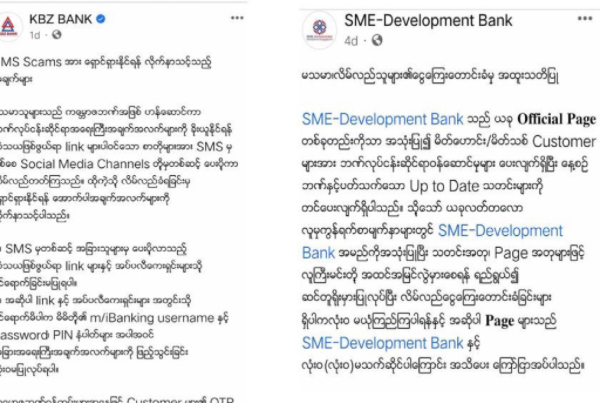缅甸银行分支和用户最多的银行之一的甘普萨银行(KBZ Bank)发布声明称,诈骗团伙冒充其名义,通过短信或社交媒体渠道发送可疑链接,窃取客户重要的银行信息。