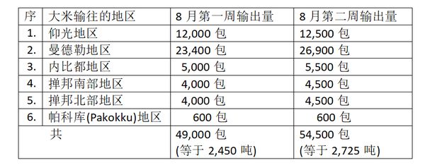 据8月15日出版的《缅甸之光》报报导,8月初头两个星期内实皆省瑞帽(Shwebo)专区往其他省邦地区输出的大米数量如下表: