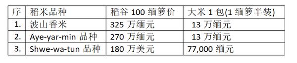 而在8月份第二周内,瑞帽县区内,波山(Pawsan)香米品种稻谷及大米、Aye-yar-min品种稻谷及大米、Shwe-wa-tun(夏季稻)稻谷及大米等的行情价钱分别如下:
