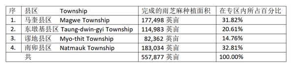 马奎专区今年雨季本来规划种植雨芝麻530,303英亩,到目前为止完成了这雨芝麻557,877英亩的种植工作,比原规划种植面积多种植了27,574英亩。各县区中,南卯县区种植面积为最多,其次是马奎县区,这两县区种植面积都约占全专区种植面积的三分之一。