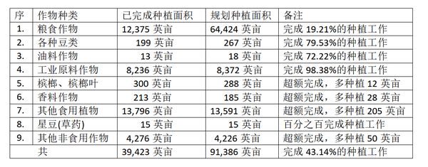 目前县区内已完成的各种作物的种植面积及原规划的种植面积如下表: