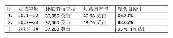 克钦邦葡萄窝专区在2021—22财政年度内种植了雨季稻36,880英亩,每英亩产量为40.98缅箩,当年地区内粮食自给率达到86.20%。2022—23财政年度时邦政府赞助了高产稻谷品种Sin-Akari 3号品种1,221缅箩,当年种植雨季稻37,060英亩,每英亩产量43.76缅箩,粮食自给率达到88.66%。现在2023—24本财政年度期间已供应了高产稻谷品种Sin-Akari 3号谷种5,000缅箩,直到8月15日为止已种植了雨季稻37,288英亩,预计今年粮食自给率可达到93%。在来年2024—25财政年度时将争取粮食自给率达到百分之百了。