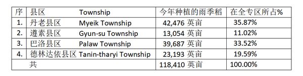 丹老专区下辖四县区,分别为丹老县区、遵素(Gyun-su)县区、巴洛(Palaw)县区及德林达依(Tanin-tharyi)县区。各县区今年雨季所完成的雨季稻种植面积如下表: