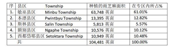 敏巫专区内下辖敏巫县区、本漂(Pwintbyu)县区、斯林(Salin)县区、额别(Ngaphe)县区及西都岱耶(Setoktara)等5个县区,该5县区今年雨季共种植了雨芝麻104,481英亩,各县区所种植的雨芝麻面积分别如下表:
