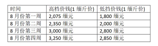 据9月7日出版的缅文《镜报》报导,马奎省色漂)(Seikpyu)县区洋葱经纪场的行情价钱,在8月份期间不断上涨,这一个月期间洋葱价钱变化情况如下表: