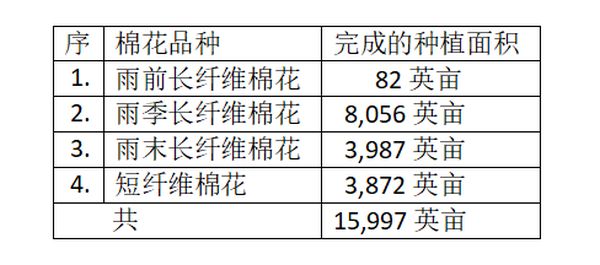 现在完成的各种棉花种植面积为15,997英亩,完成了100.01%的规划面积种植工作。