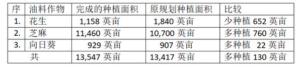 今年雨作物种植季节期间,蒙育瓦县区规划种植油料作物13,417英亩,自6月份开始有关种植工作,到目前为止完成了这些油料作物13,547英亩的种植工作,比原规划种植面积多种植了130英亩。目前完成的油料作物种植面积与原规划种植面积如下表: