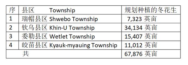 另外在冬作物种植季节期间,瑞帽专区内的各县区也规划种植冬花生67,876英亩,各县区规划种植的冬花生种植面积如下: