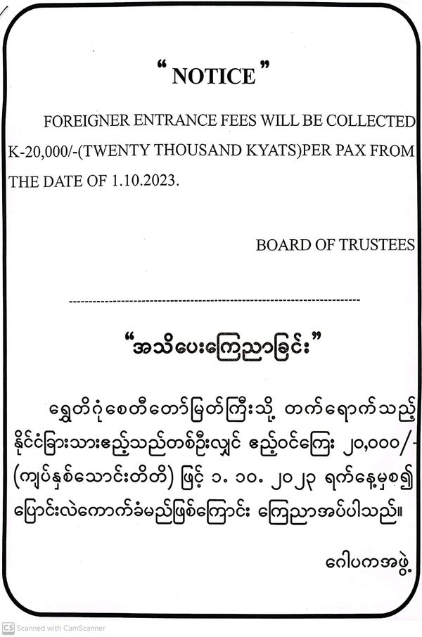大金塔理事会发布了一则双语(缅甸语和英语)公告,通知从10月1 日起,每位参拜仰光大金塔的外国游客将需支付2万缅币的门票费用。
