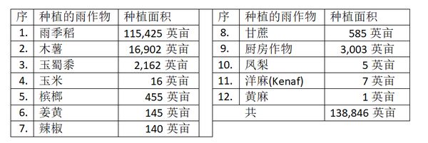 宫漂县区在今年雨作物种植季节期间,规划种植各种雨作物138,846英亩。自6月份第1周开始有关种植工作,到目前已百分之百完成了有关种植工作。种植的作物中以雨季稻面积为最多,种植了11万多英亩。其余作物包括木薯、玉蜀黍、厨房作物等等。各种作物所种植的面积如下表: