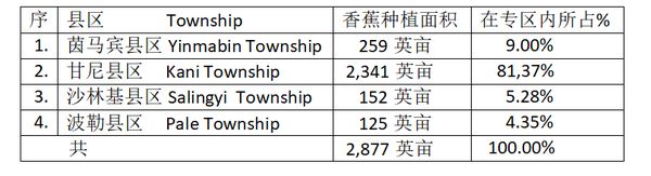 今年茵马宾专区内的4个县区所种植的香蕉作物面积如下: