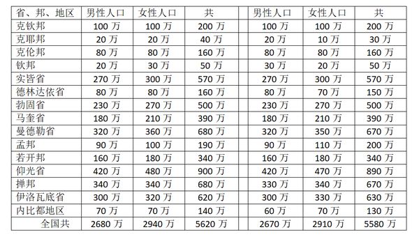 (三)各省邦中,总人口数没有变化,只是男女人口比例起变化的省邦有1个,这就是钦邦,该邦男性人口减少10万,女性人口增加10万。
