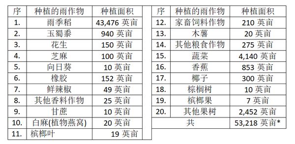 (*虽然县农业局方面说已完成56,2223英亩种植工作,但统计这20种雨作物种植面积时只得53,218英亩,还差3千多英亩,可能是计算时有些作物遗落了。)