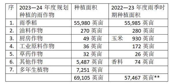 (**农业局负责人说2022—23年度雨作物种植了68,000多英亩,现在却相差1万多英亩,可能是其他作物、多年生植物等没有统计在内。)