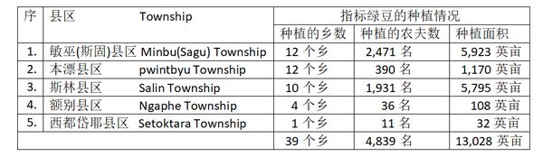 这绿豆将在专区内的敏巫(斯固Sagu)县区、本漂(Pwintbyu)县区、斯林(Salin)县区、西都岱耶(Setokkara)县区及额别(Ngaphe)县区等5个县区内种植。农业局将与5个县区内的农夫们齐心协力合作,争取在2023—24财政年度雨季内种植的这些绿豆单位产量能达到1英亩20缅箩的指标产量。各县区种植此指标绿豆的乡、农夫人数及种植面积如下表: