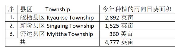 皎栖专区内所属的3个县区为皎栖县区、新阶(Singaing)县区及密达(Myittha)县区。这3个县区今年雨季种植的向日葵面积分别如下:
