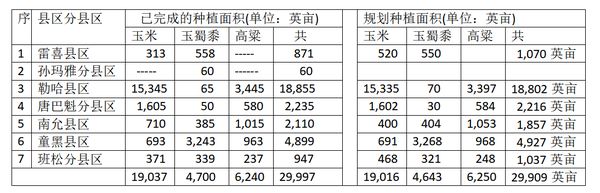 各县区分县区已完成的种植面积及规划种植面积如下表:
