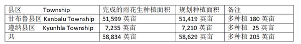 甘布鲁专区内的两个县区—甘布鲁县区及遵纳(Kyunhla)县区目前完成的雨花生种植面积及原规划的种植面积如下表:
