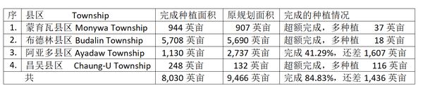 蒙育瓦专区属下的4个县区分别为:蒙育瓦县区、布德林(Budalin)县区、阿亚多(Ayadaw)县区及昌吴(Chaung-U)县区。该4个县区目前所完成的雨向日葵种植面积及原规划的种植面积如下表: