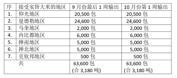 而在9月份最后1周及10月份第1周内由实皆省向其他省邦地区输出大米情况如下: