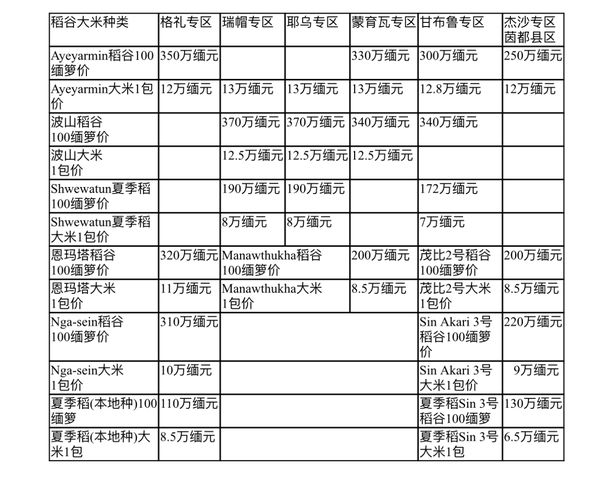 (稻谷价为100缅箩价,而大米价为1包价。在缅甸,大米1包容量为1.5缅箩,按重量算为30缅斤,按公斤算约为50公斤。)